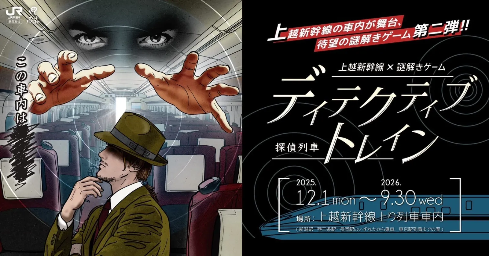 『ディテクティブ・トレイン ー探偵列車ー』は、JR東日本新潟支社とナゾトキアドベンチャーがコラボした上越新幹線×謎解きゲームの第2弾。実際に新幹線に乗りながら、車内で行われている「怪しい取引」の謎を追う体験型イベントです。