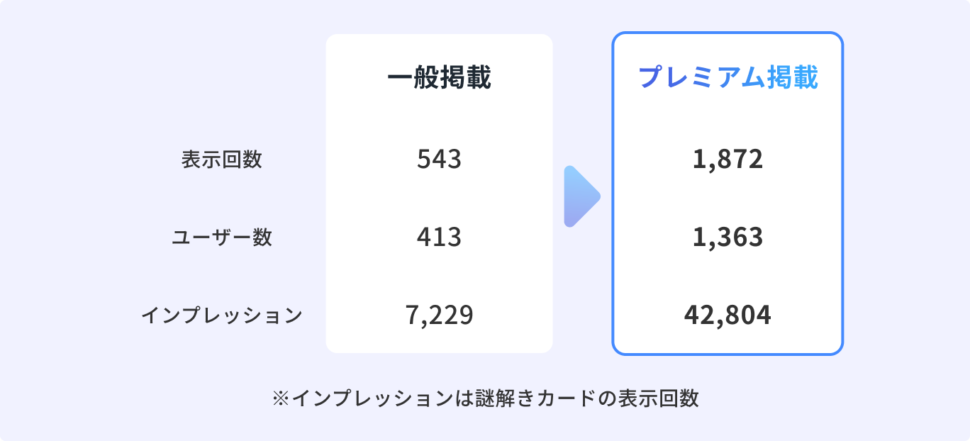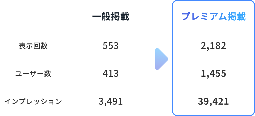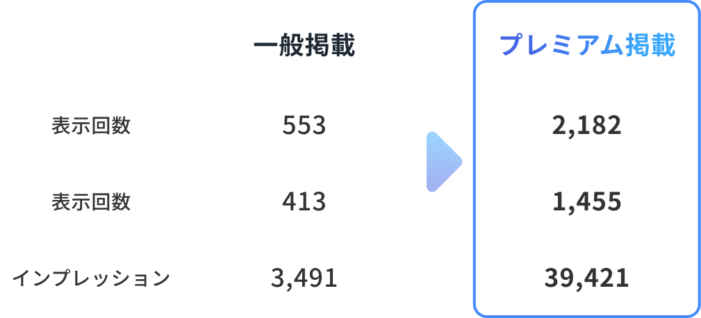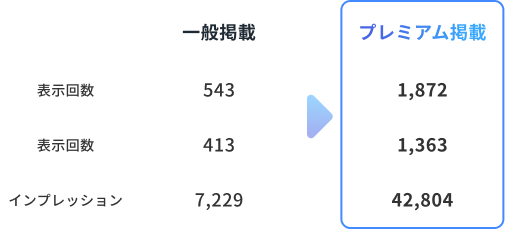 掲載で表示回数・閲覧数が向上。特にインプレッションでは大幅な伸びが見込めます