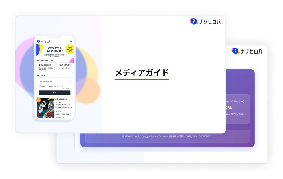 ナゾヒロバのトップページや詳細ページに直接バナー画像を掲載し、 多くのサイト訪問者にアプローチできます。 また、バナーのインプレッションなどのレポートデータも掲載後にお渡しします。