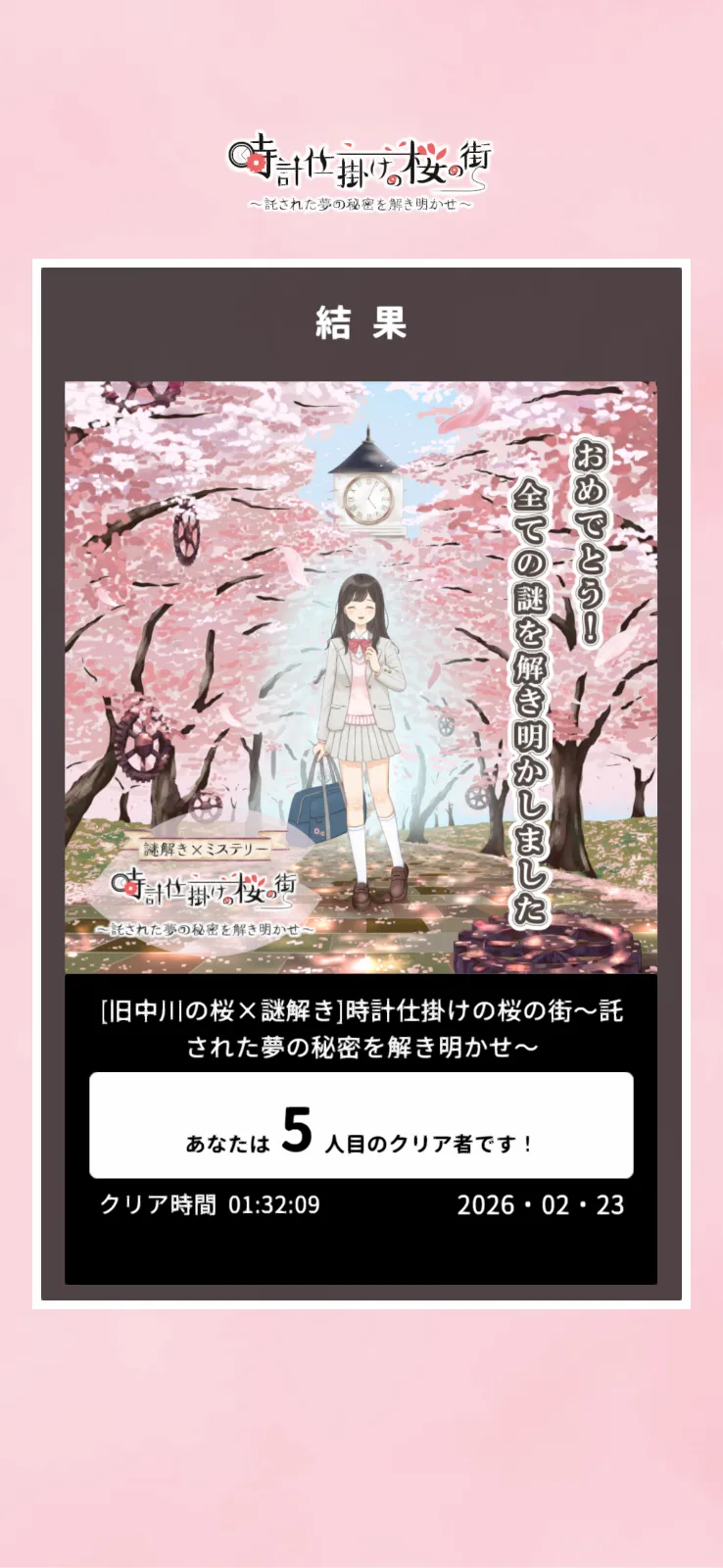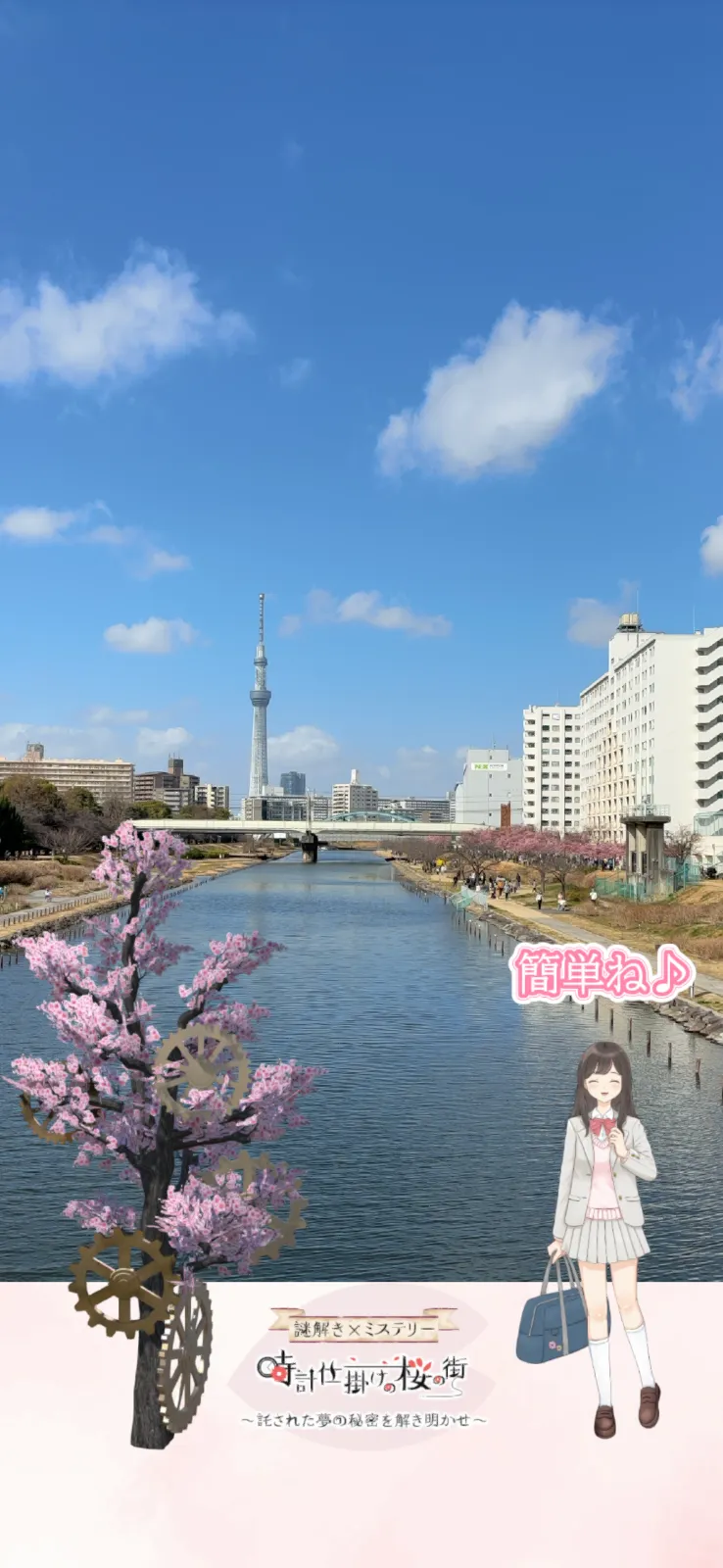 冊子はなく、スマホのみです。 旧中川はスカイツリーと河津桜が一緒に撮れる場所の為人が多かったですが、謎解きするのは河津桜がある上側ではなく下側だったため、人の影響なくてやりやすかったです。 ソメイヨシノの時期は下なので大変だと思います。ご注意ください。 ゲームっぽい画面と、少女との会話ですすみ、動く3D謎解き画面に苦戦しました。はじめはそれでもなんとかできたのですが、終盤はあちこち見返したりも大変で、外でやるには人込みを避けて集中できるところでやった方がいいです。 メモが書き込めるようになっていたり、マップがGPSで誘導されて見やすかったので使いやすい部分もありました。 そこそこ歩きます。バッテリーくいます。 ストーリーは、いいお話でした。桜の設定が面白かったです。 桜の写真を撮りながらのんびり周りましたが、謎解きだけなら1時間位でできるのではないかと思います。
