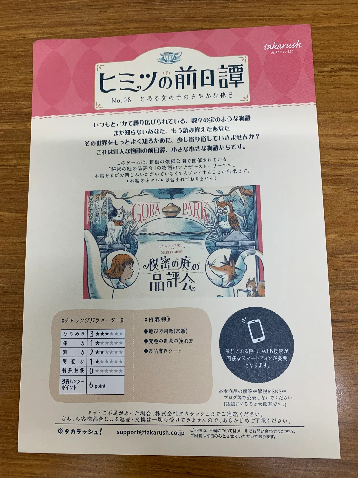 本編は箱根強羅公園周遊「秘密の庭の品評会」です。 本編の余韻が残っているうちにやりました。謎は軽めですが、本編同様にお茶がテーマで世界観がよみがえりました。 このシリーズは工作物がテーマにあっていてとてもいいです。 こんなものができあがるのね!という楽しみがあるので、工作好きな方にはおすすめです。