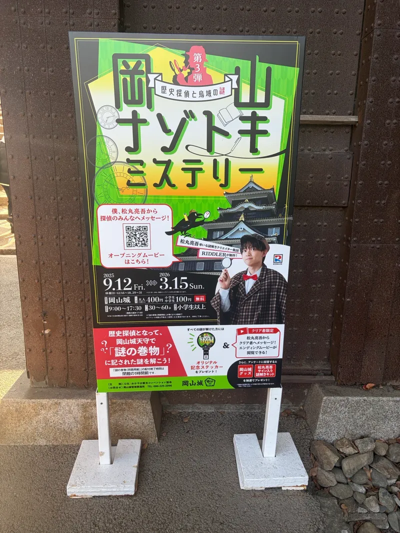 岡山に立ち寄った際にプレイしました! 路面電車が走る街並みの雰囲気が良く、岡山駅から徒歩20分ほどで岡山城に到着。 謎解きは問題数こそ少なめで難易度も高くはありませんが、解きごたえがあって楽しめました。 岡山城の天守入場料(400円)を払えば無料で参加できます。親子連れでプレイしている方が多かったです。 岡山城について事前知識はほぼゼロでしたが、城内の展示や映像で歴史を学べたのがよかったです! 謎解きをきっかけに岡山城のことをもっと深掘りしたくなりました。 観光と謎解きを一緒に楽しめるので、岡山を訪れる際におすすめです!