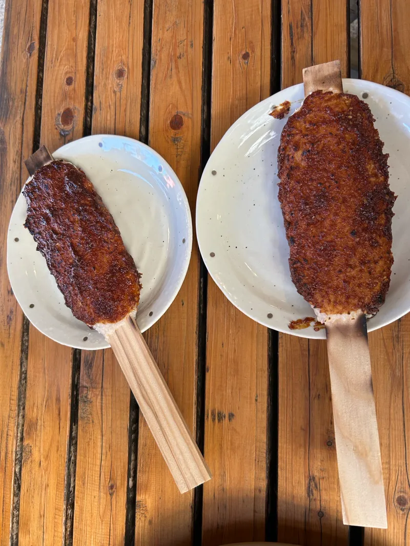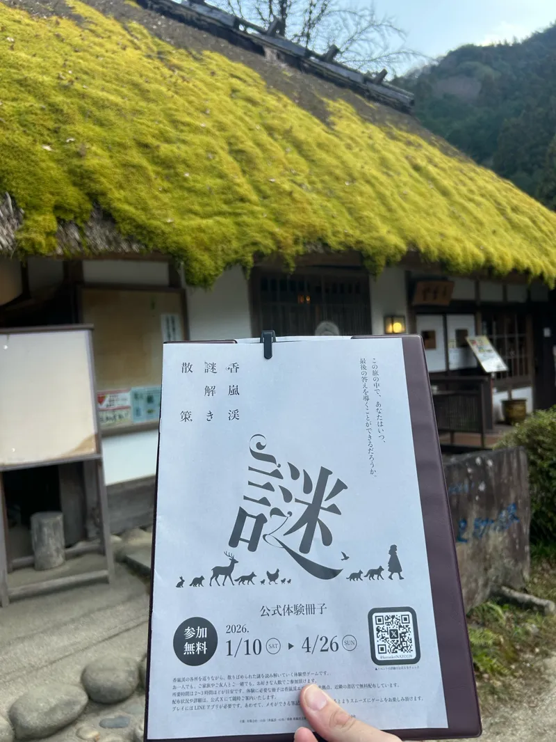 車の場合、駐車場は足助第二駐車場停めると謎冊子も置いてあり、開始しやすいです。 歩く距離は6000歩くらいで、座る場所も多くあるので、それほど疲れず回れます。 最後の謎は少し考えました。 無料の謎解きですが、それなりに難しい問題もあり、小学生の子供には難しい難易度でした。 大人でもしっかり楽しめます! 時間は子供と歩くのと、軽食食べたりヒント出しながら解いたので、少し多めにかかってます。 注意点としては、クーポンがついていますが、クリアした後しか使えないです。途中の店にクーポン使える店ありますが、使いたい場合はクリアした後にまた店まで歩く必要あります。 五平餅美味しかったです!