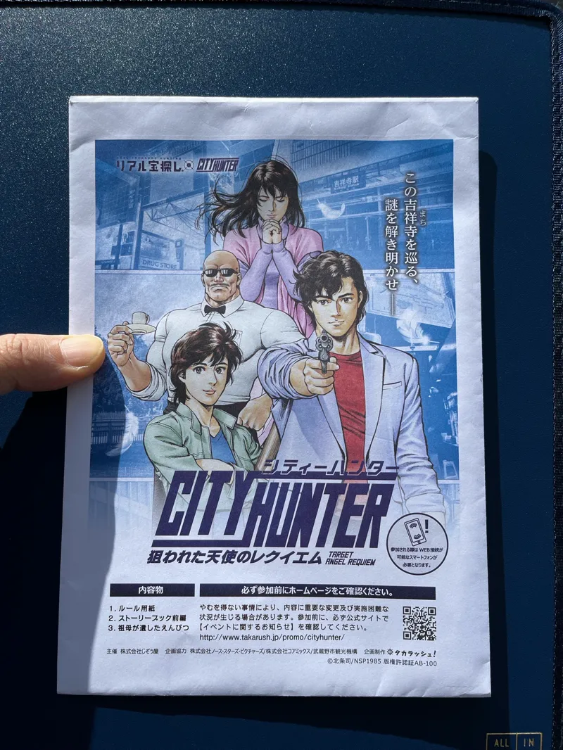 小春日和の本日、2026年3月末で本謎解きがクローズになるとのことで、まだ未プレイだったので楽しくプレイしてまいりました。 約4時間でクリア。難易度は3.2切り下げ3の評価としたいと思います。自分にとっては程よい感じの難易度でした。 当該謎解きの初回開始から6年の年月が経っており、街の景観やオブジェもだいぶ変わってしまっているのだろうなと想定しながら参加しましたが、思いの外、この謎解きに使用するものに関しては大きく変わっていなかったというのが率直な感想です。 ただし、謎解き冊子上の報告場所となっている「CAFE ZENON」「ZENON SAKABA」は、特設ホームページにもある通り、「GALLERY ZENON」「CREATORS LOUNGE ZENON」という2店舗に業態変更になっており(報告をしに行ったときにオーナーさんらしき方が業態変更について語っていました)、この点では月日の移り変わりを感じました。 なお、優先報告場所である「GALLERY ZENON」の休業日は「CREATORS LOUNGE ZENON」でも報告を受け付けてもらえるので、謎解き進行上の支障はないように作られています。 また、謎解きキットは朝9時半から開店しているBOOKSルーエさんで手に入れましたが、まだ見た感じだいぶ残っているようでした。(限定版のXYZクリップボード付DX謎解きキットもまだ残っていました) 吉祥寺駅を中心に、少し広めの程よい範囲を周遊します。最近、他の謎解きでも吉祥寺に何度か足を運んでいるので、すっかり駅前も土地勘が付いて慣れたもので、だいぶスイスイと周遊ができました。周遊自体も、色々と趣向が凝らされていて楽しかったです。 コラボのストーリーもなかなか自分好みで、クスッとしてしまうシーンも多く、シティーハンターをマンガで読んでいた頃の記憶が蘇ってきましたね。 シティハンター現役世代にとっては、上記のように謎解き以外にストーリーも楽しめる優良な謎解きだと思います。