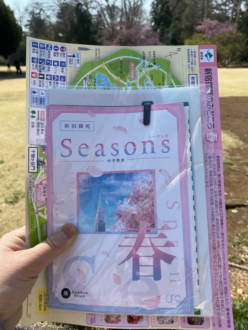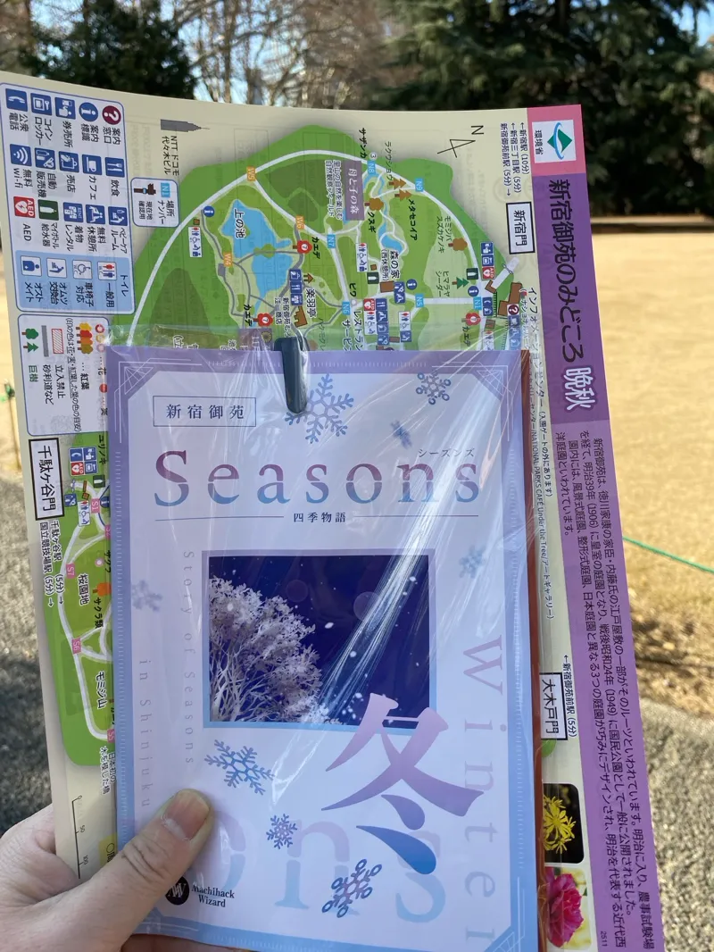 秋3時間、冬2時間半、春1時間半、夏3時間、最終章2時間40分、合計12時間40分(^^; 秋(2025.11) 地下謎が当日縛りの制限があったために、1日で解き切れると思えず、泊まりがけにしたので、帰る途中で新宿御苑に寄り道して解きました。紅葉真っ盛りなのと、菊花壇展のすぐ後で、紅葉と菊を楽しみながら解きました。初めての地で景色を見ながら歩いていたので迷子になってしまい、疲れました(^^; 冬(2025.12) 公式サイトで見たあらすじによると、クリスマスの時期のストーリーのようだったので、クリスマス近い頃に行きました。冬というよりは秋のフィナーレでした(^◇^;)季節ごとに周遊するコースも考えられているようです。一部の手がかりが撤去されていましたが、LINEで対応されていて、問題なく解くことができました。 春・夏・最終章(2026.03) のんびり構えていたら、4月19日で終了することを知り、夏を自宅で先に解いてから新宿御苑に行きました。桜の時期だからか、すごい混雑でした。花見を楽しみながら春を解いて、最終章のキットを受け取って帰宅。おうちで最終章を解いて、クリアしました。間に合ううちに完走できてよかったです。クリア後に追体験できるようなので、終わる前にもう一度新宿御苑に行ってみます。