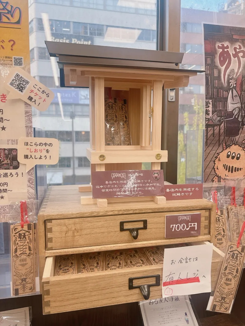 神保町の書泉グランデでプレイしました。本屋さんのフロアを歩き回りながら解く謎解きは普段あまり見ない種類の本棚もゆっくり見ることができてとても楽しかったです。売り場の一角が謎解き商品紹介棚になっていました。そこで怪しい木のお札を購入すると謎解き冊子貰えて、謎解きが始まる!という流れも、可愛らしいストーリー仕立てになっていてほっこりしました。問題数は多くないですが、座るところもないので、丁度楽しめるボリュームだと思いました。